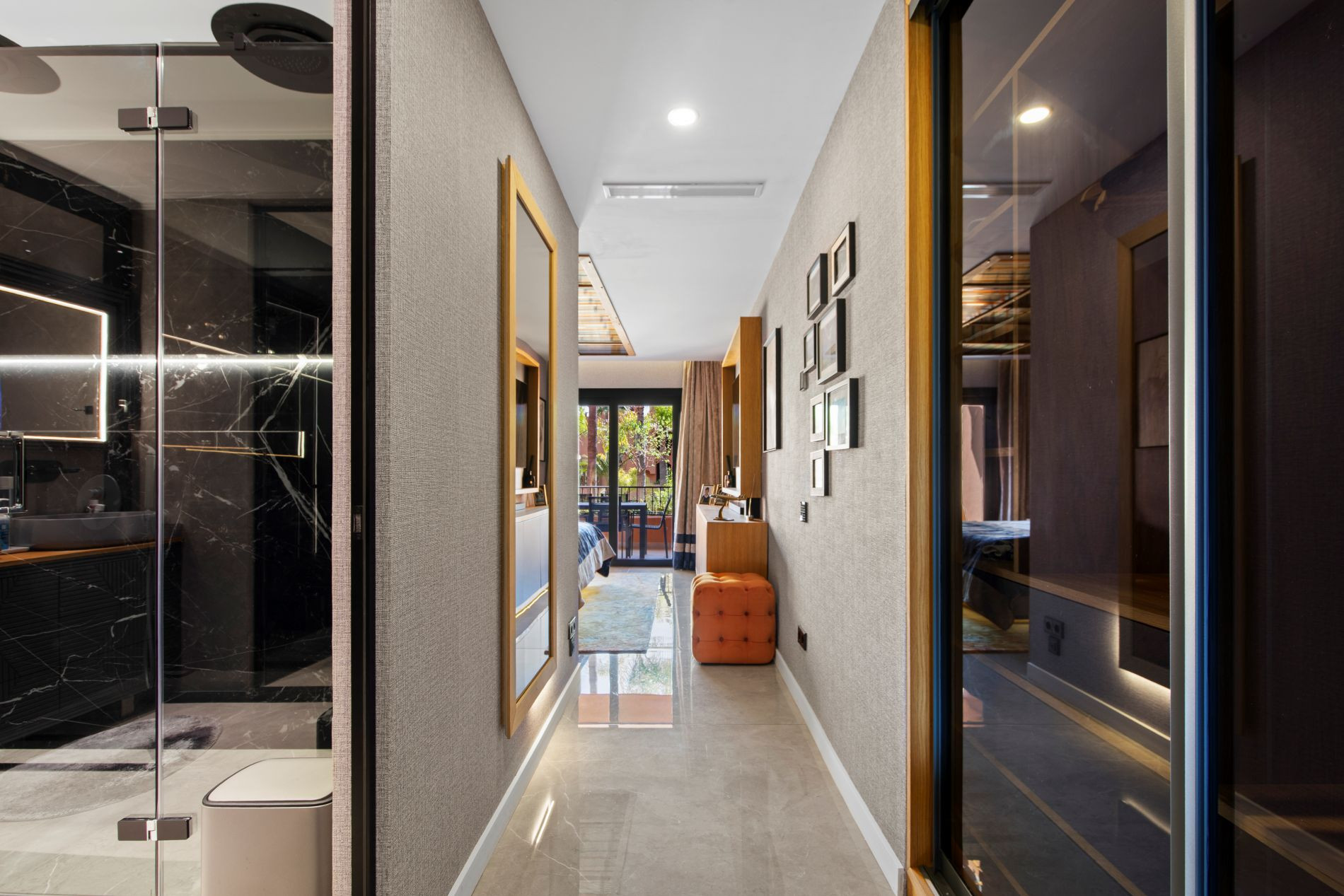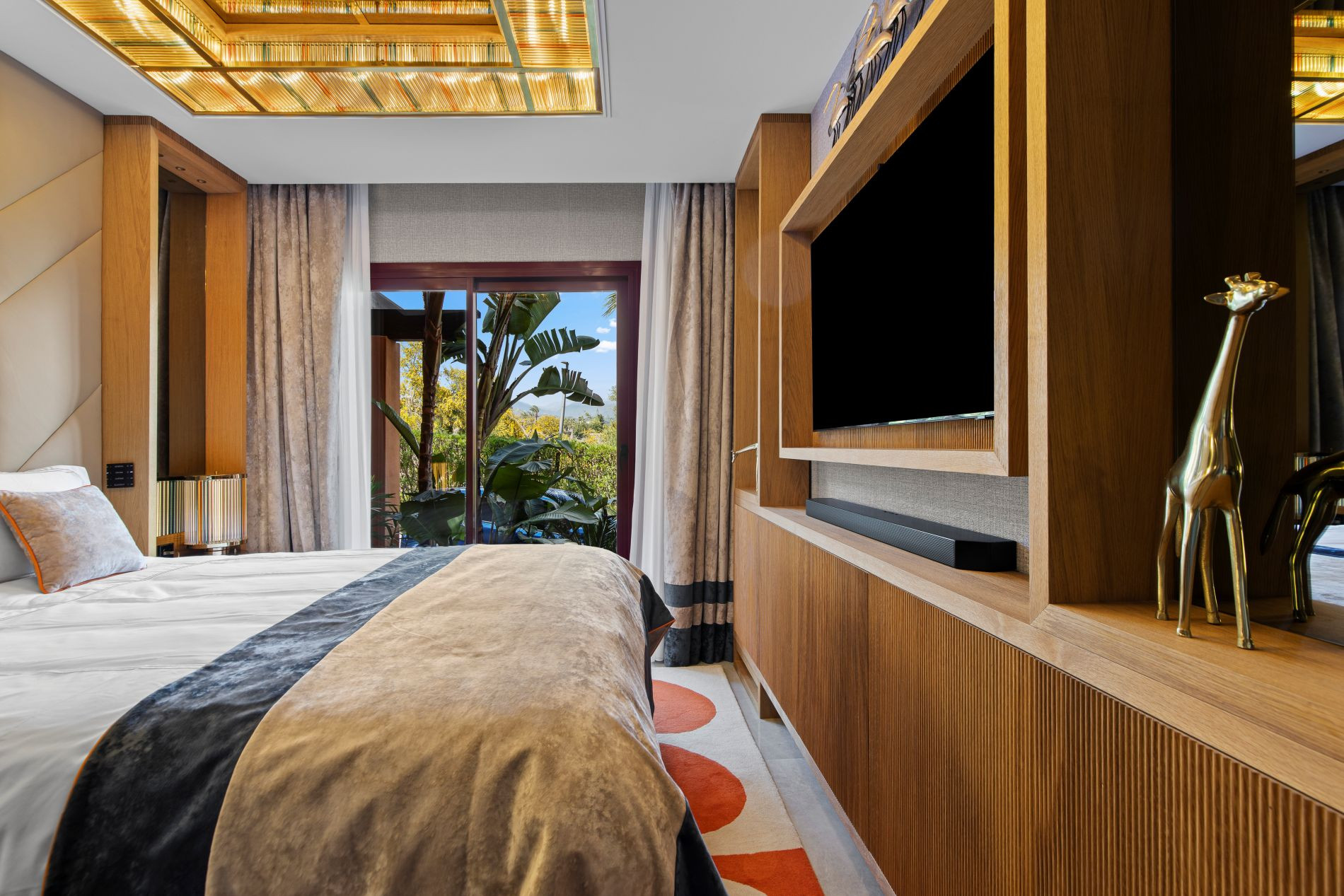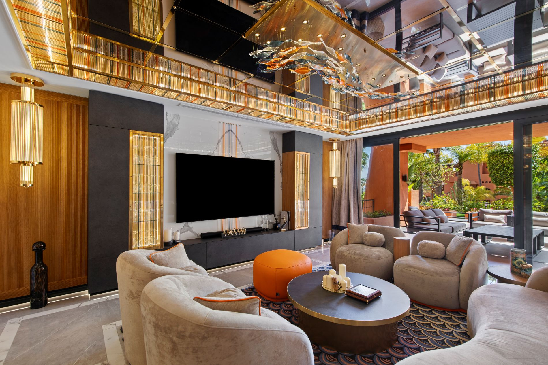 Das Apartment bietet drei Schlafzimmer mit eigenem Bad mit Ankleideräumen und eine großzügige Terrasse, die direkt auf die Gärten öffnet, in einer Umgebung voller Privatsphäre.