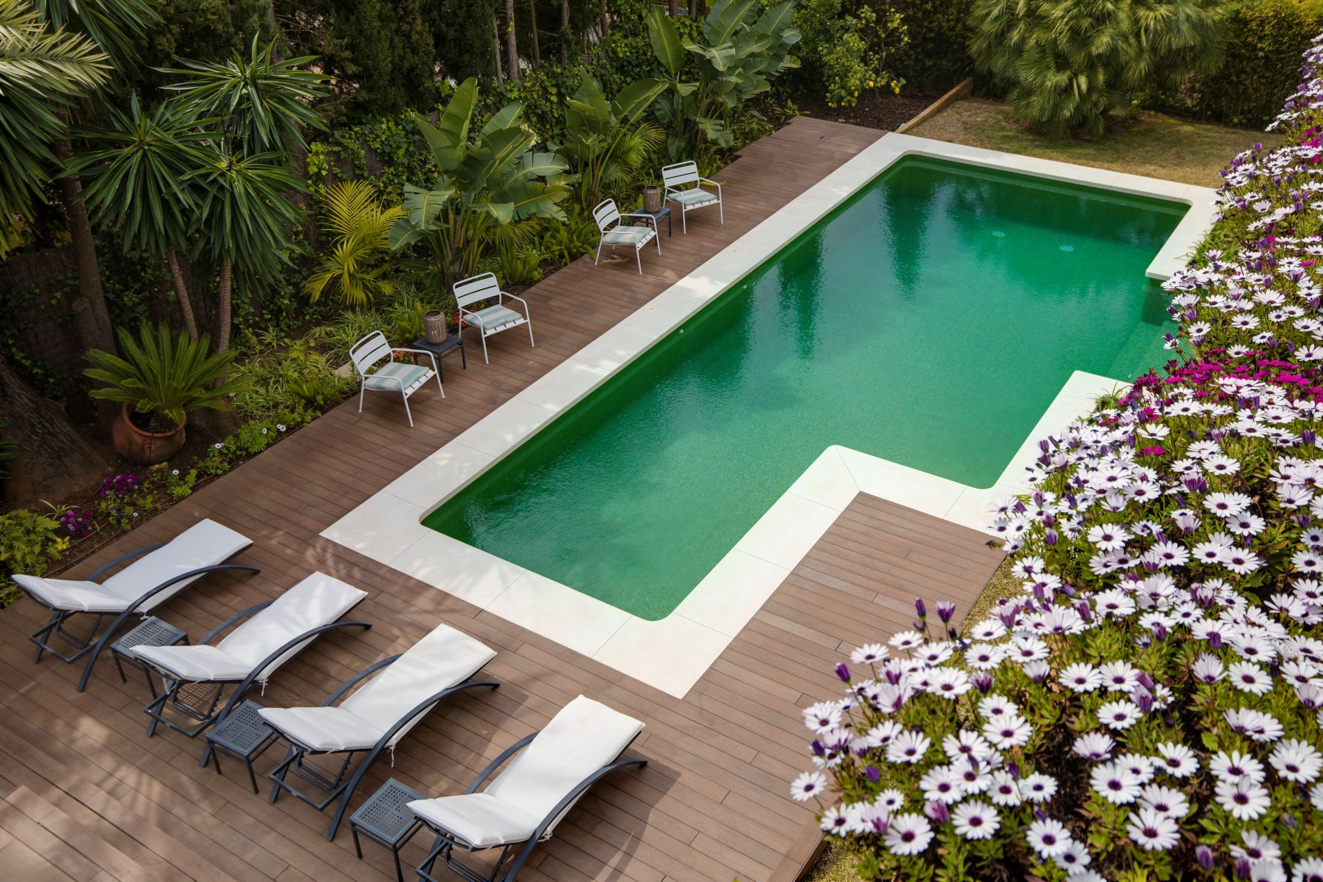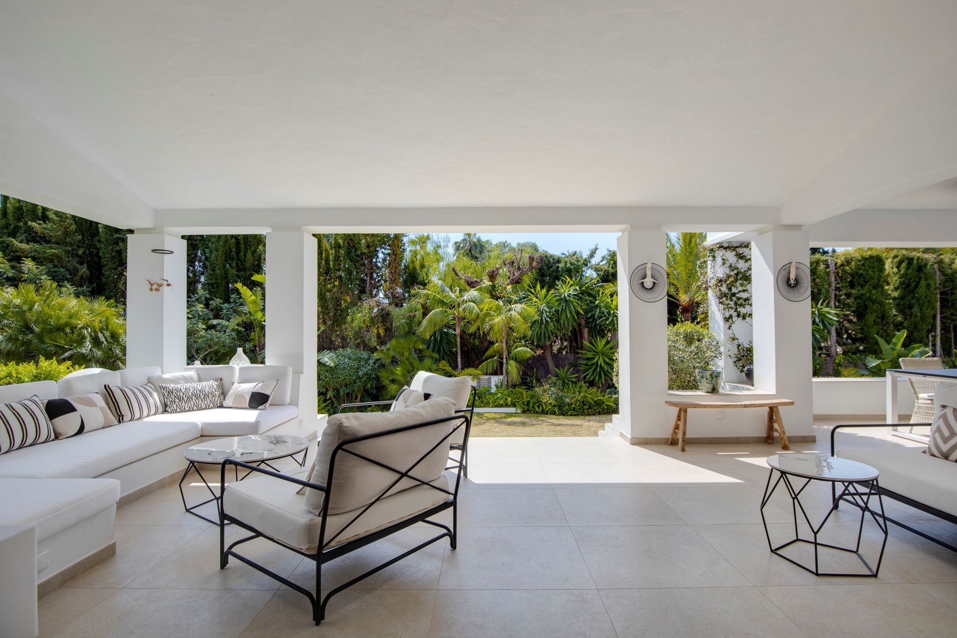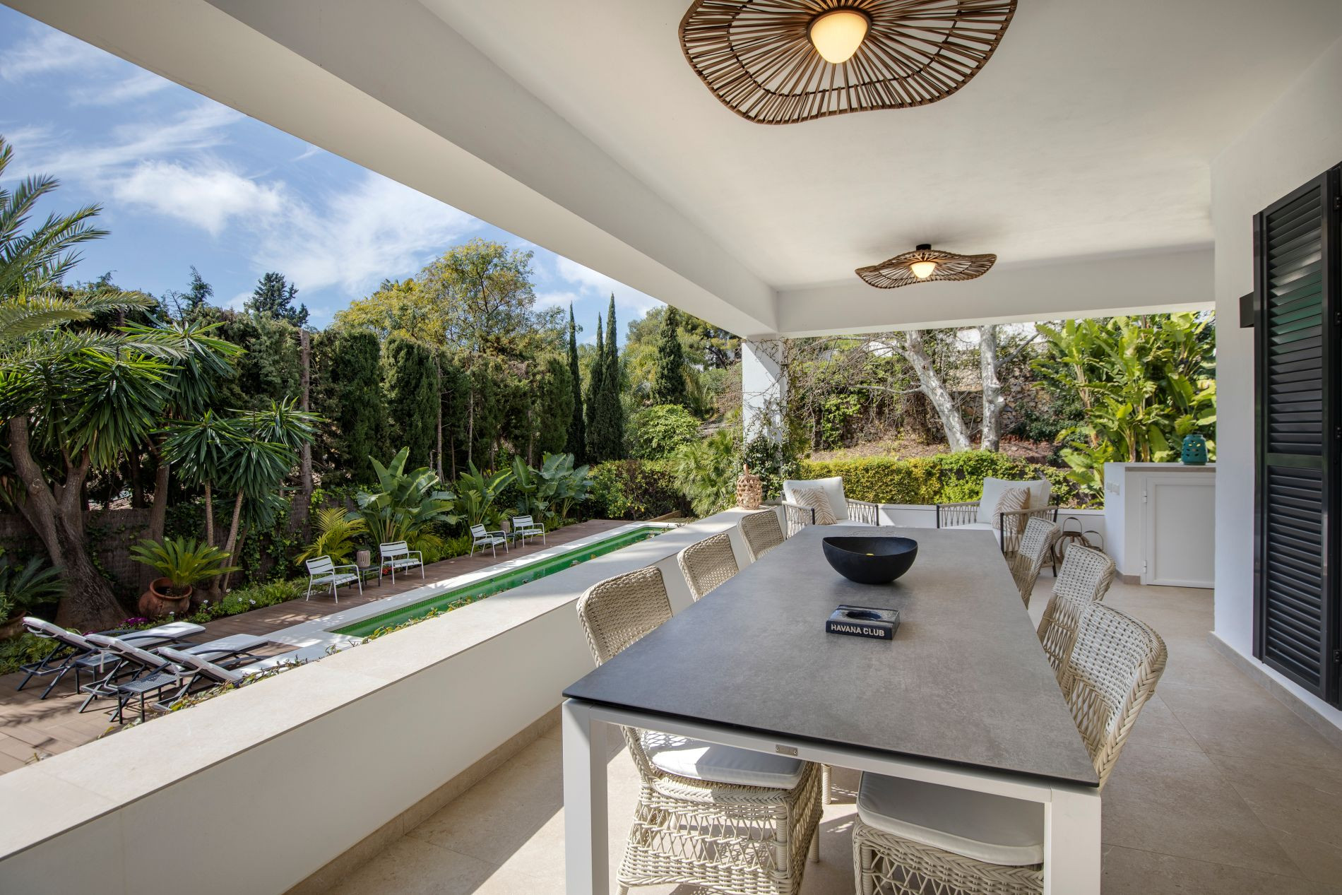 The mature, landscaped garden reinforces privacy and adds depth to the setting. From the upper level, the villa enjoys open views towards the sea and surrounding greenery, while the rooftop solarium offers sweeping 360° views encompassing the Mediterranean, the mountains, and the distinctive landscape of Sierra Blanca.