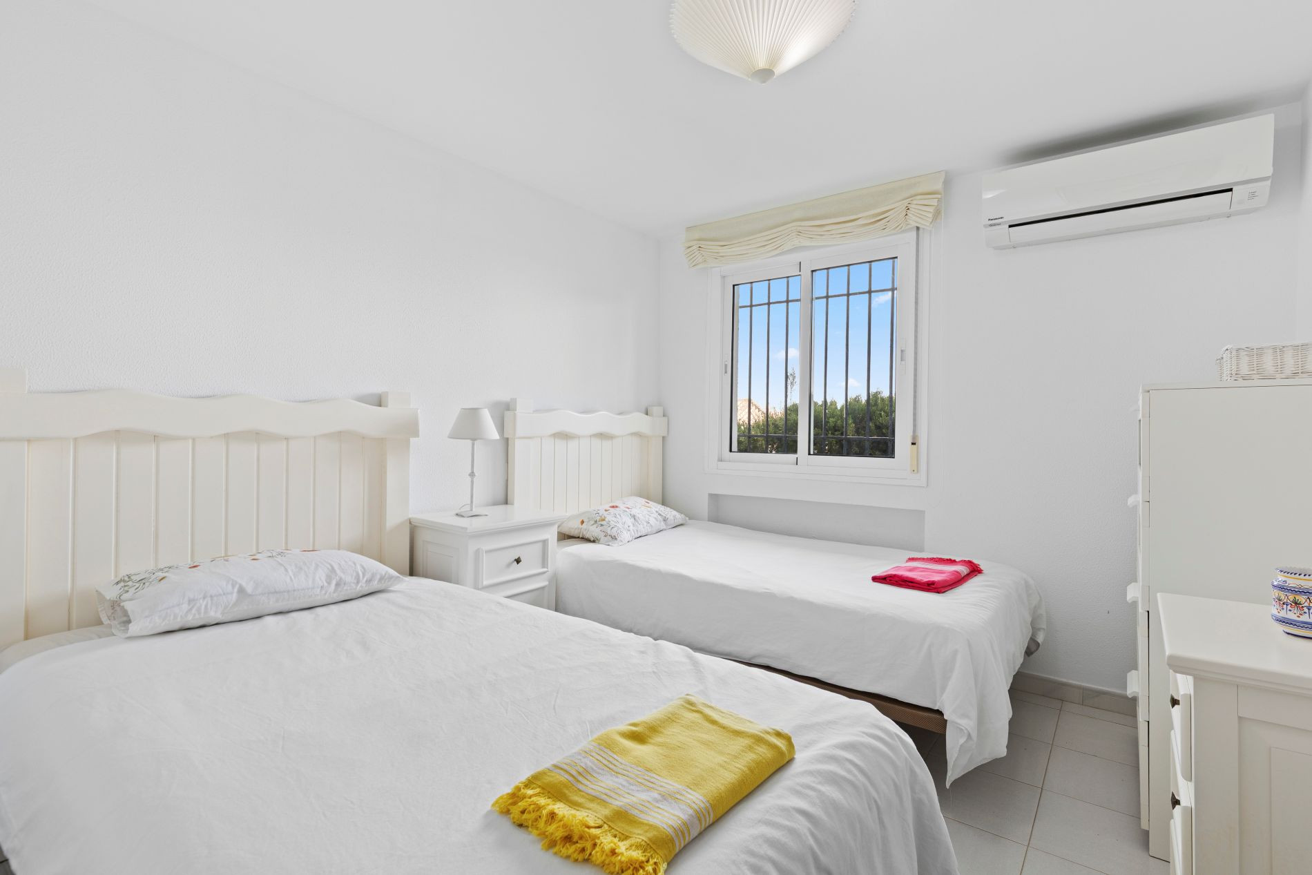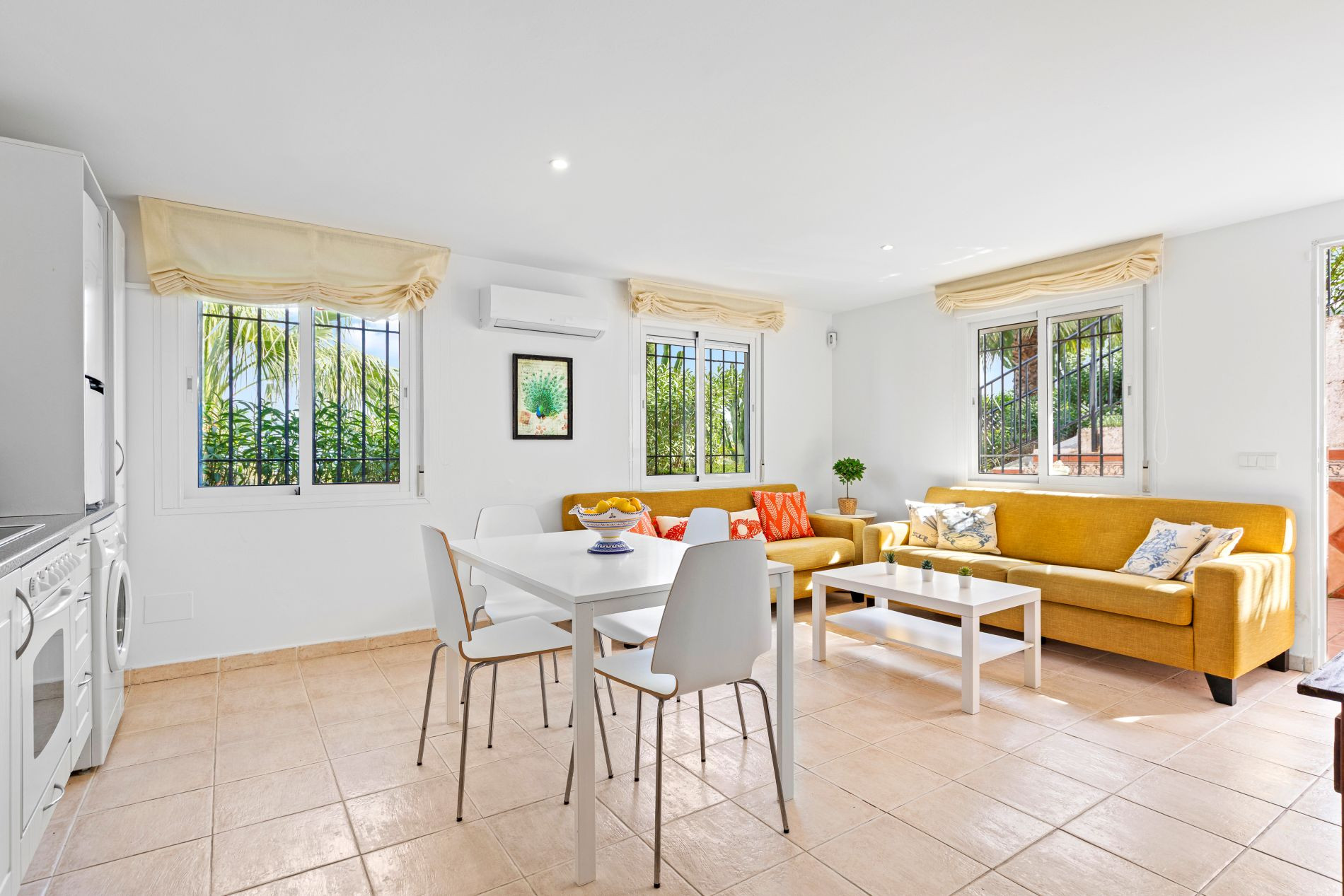Desde la entrada se accede por escaleras a la vivienda principal de 147m2, a la piscina y a sus extensas terrazas con vistas panorámicas al mar . Allí se desarrolla la vida diaria: salón con salida directa al exterior, cocina independiente con área de lavandería y tres dormitorios con dos baños. El espacio exterior es uno de los grandes valores de la casa: una amplia terraza que se vive de verdad, con zonas abiertas y una parte acristalada que permite utilizarla durante todo el año.